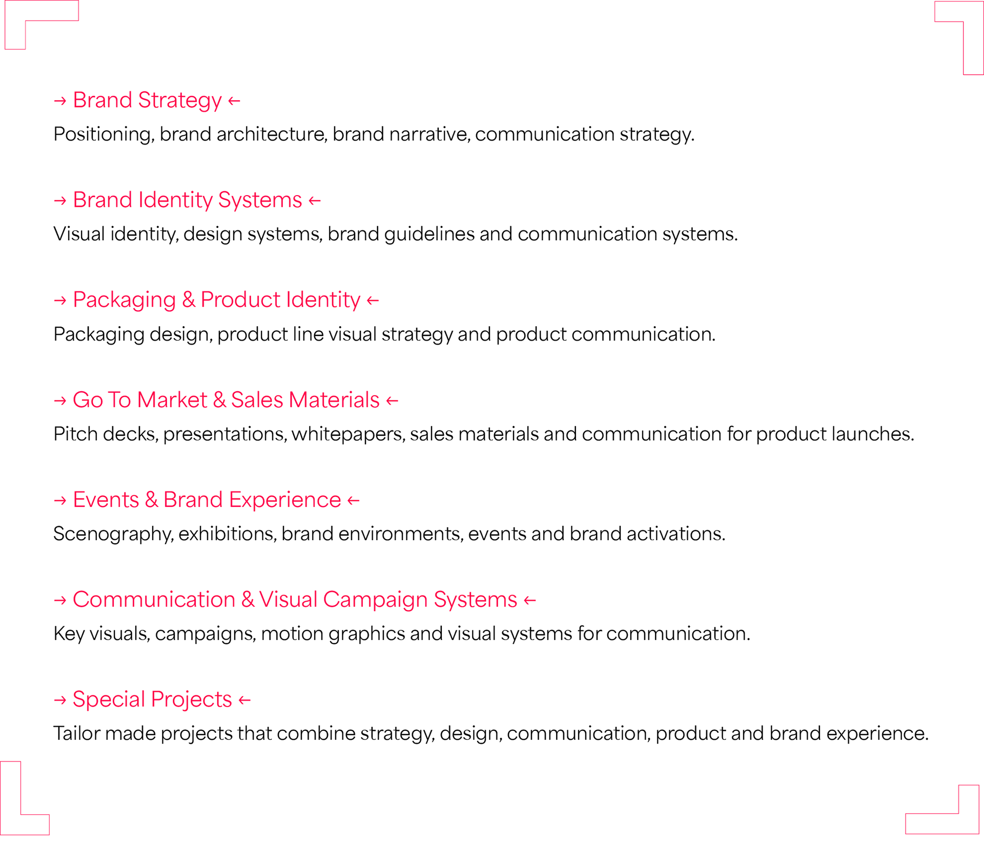 My clients range from startups to established companies, industrial businesses, technology companies and event agencies that need creative direction and strategic design support.
